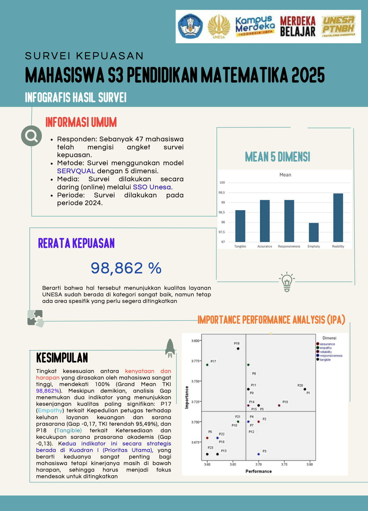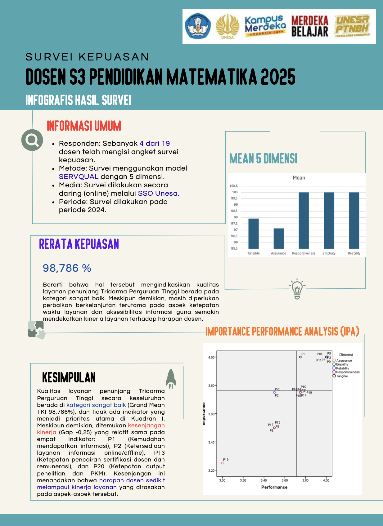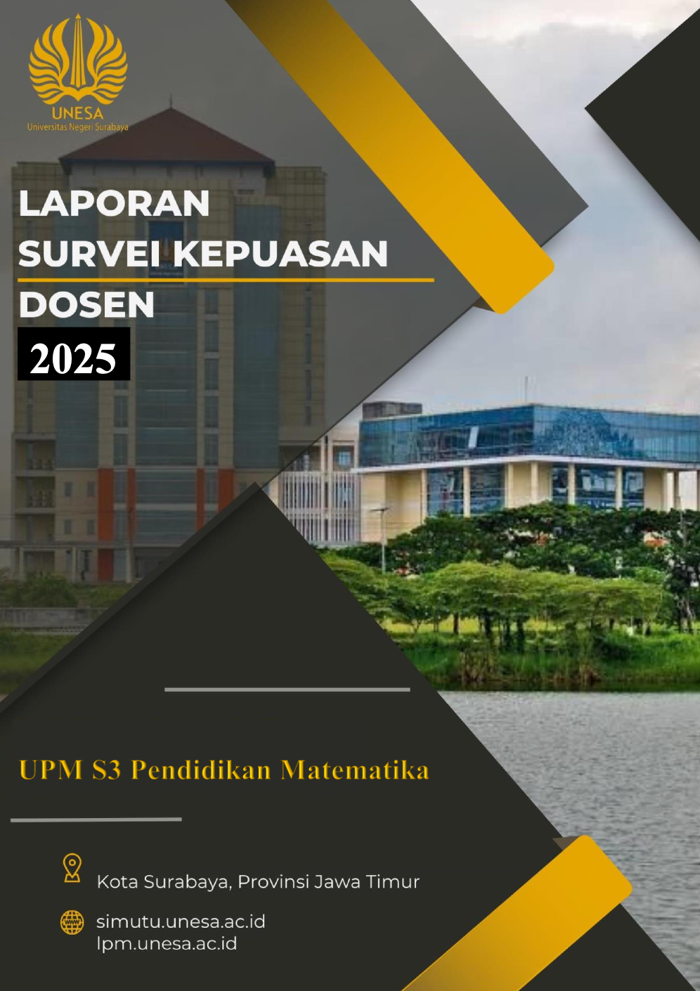 Hasil dari Survei Kepuasan Pelanggan FMIPA yang dilakukan oleh Lembaga Penjaminan Mutu (LPM) Unesa pada tahun 2025 untuk Dosen dan Mahasiswa Program Studi S3 Pendidikan Matematika, Fakultas Matematika dan Ilmu Pengetahuan Alam (FMIPA) Unesa. Metode yang digunakan adalah survei cross-sectional dan instrumen angket yang disematkan di SSO Unesa. Hasil disajikan sebagai berikut: